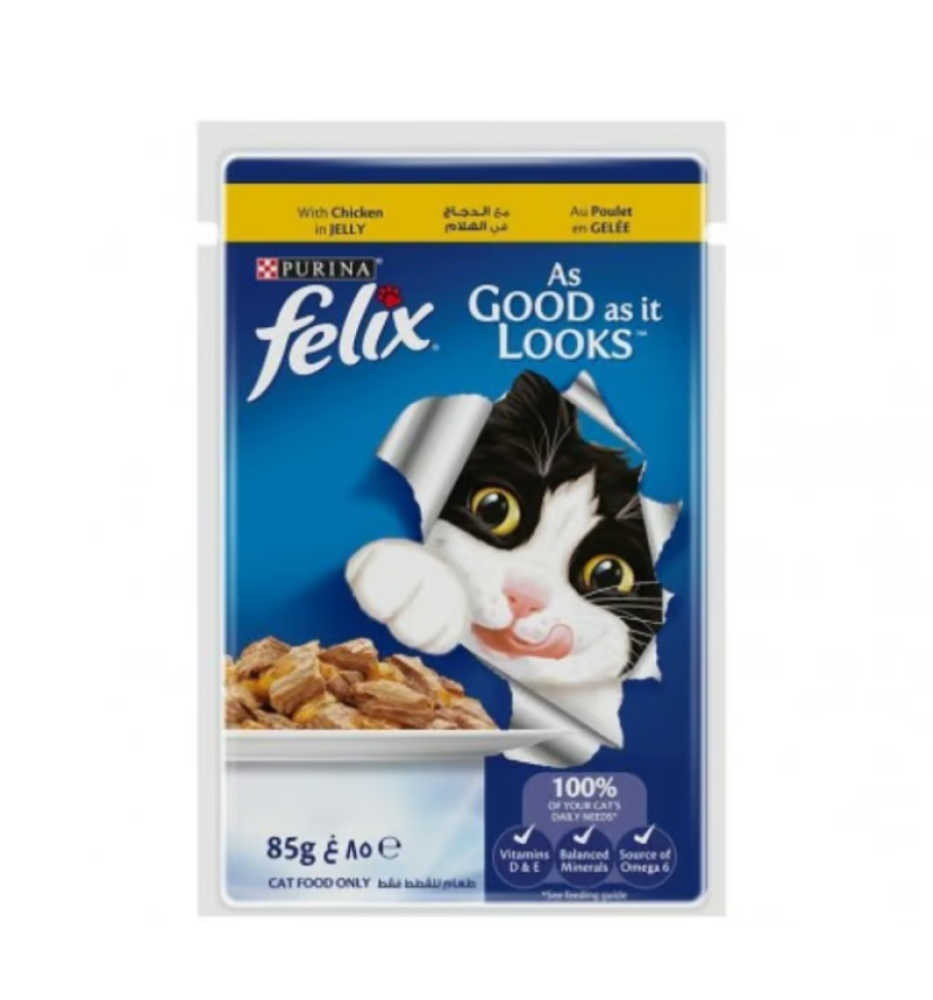 - فيليكس اكل قطط يحتوي على قطع دجاج طازجة بالمرق، طعام شهي يجعل القطط متحمسة وقت الوجبة ويُعد من أفضل خيارات التغذية اليومية.